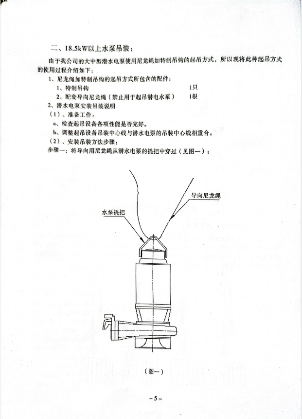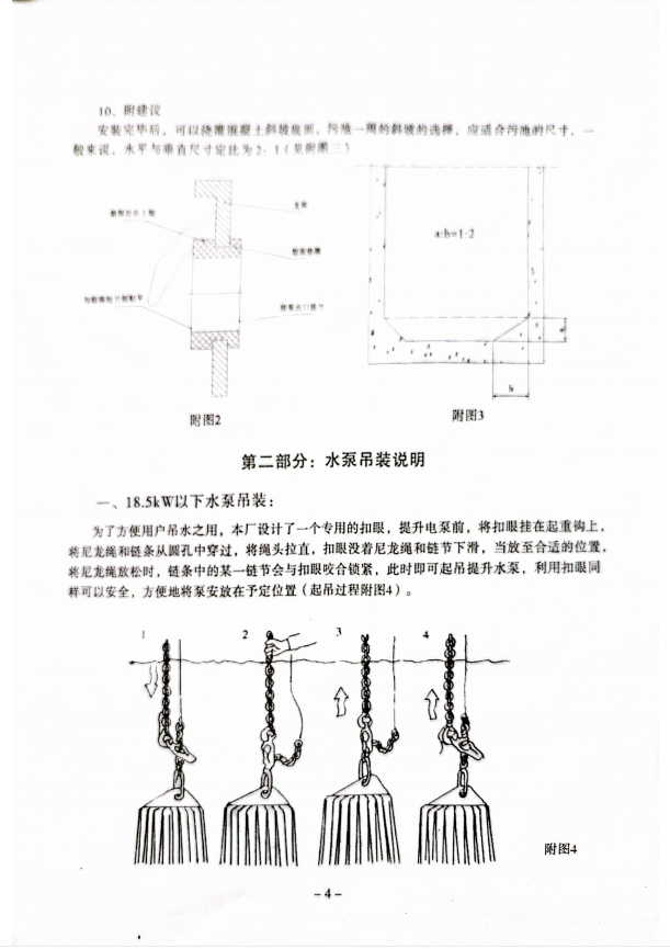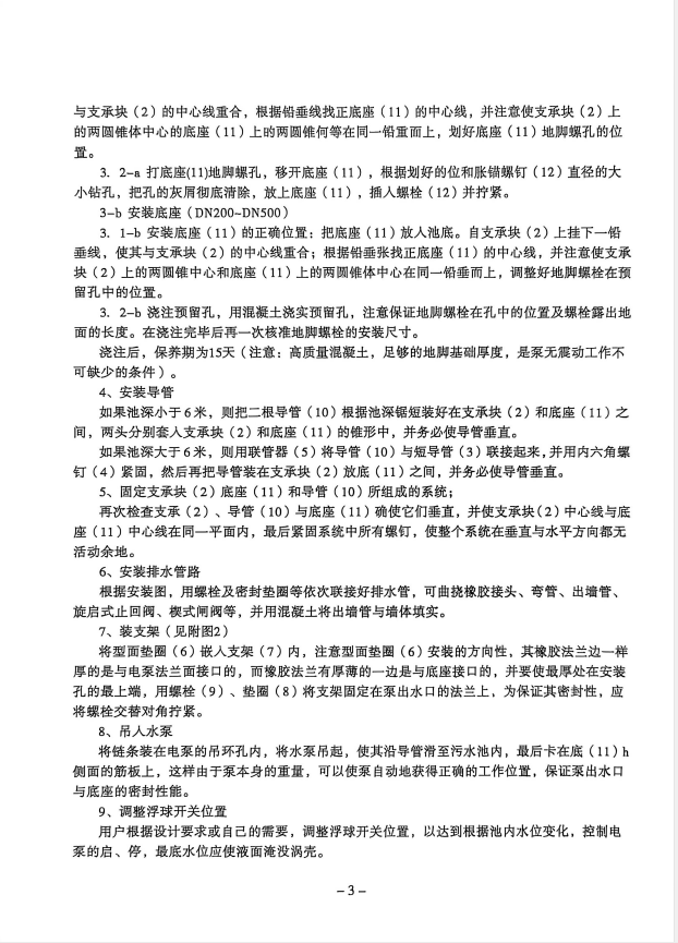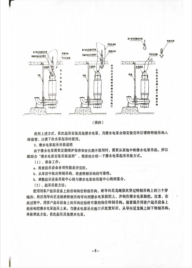 這種方式可根據用戶要求配備液壓開關,中間端子箱及全自動保護控制柜。在選型時,應注明泵的型號、安裝方式、池深、泵控制保護方式,以便提供合理的系統。如用戶特別需要,我們可提供特種材料的泵。