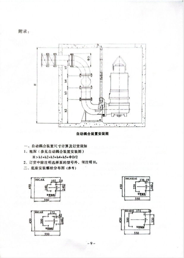 在這種安種形式中,泵與耦合裝置相連,耦合底座固定于泵坑低部(在建造污水坑時,與預埋好地腳螺栓,使用時將耦合底座固定即可)泵可以在導軌中上下自動移動,當泵放下時,耦合裝置自動地與耦合底座耦合,而提升泵時與耦合底座自動脫離。